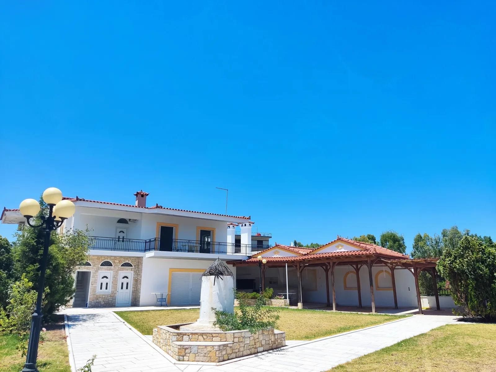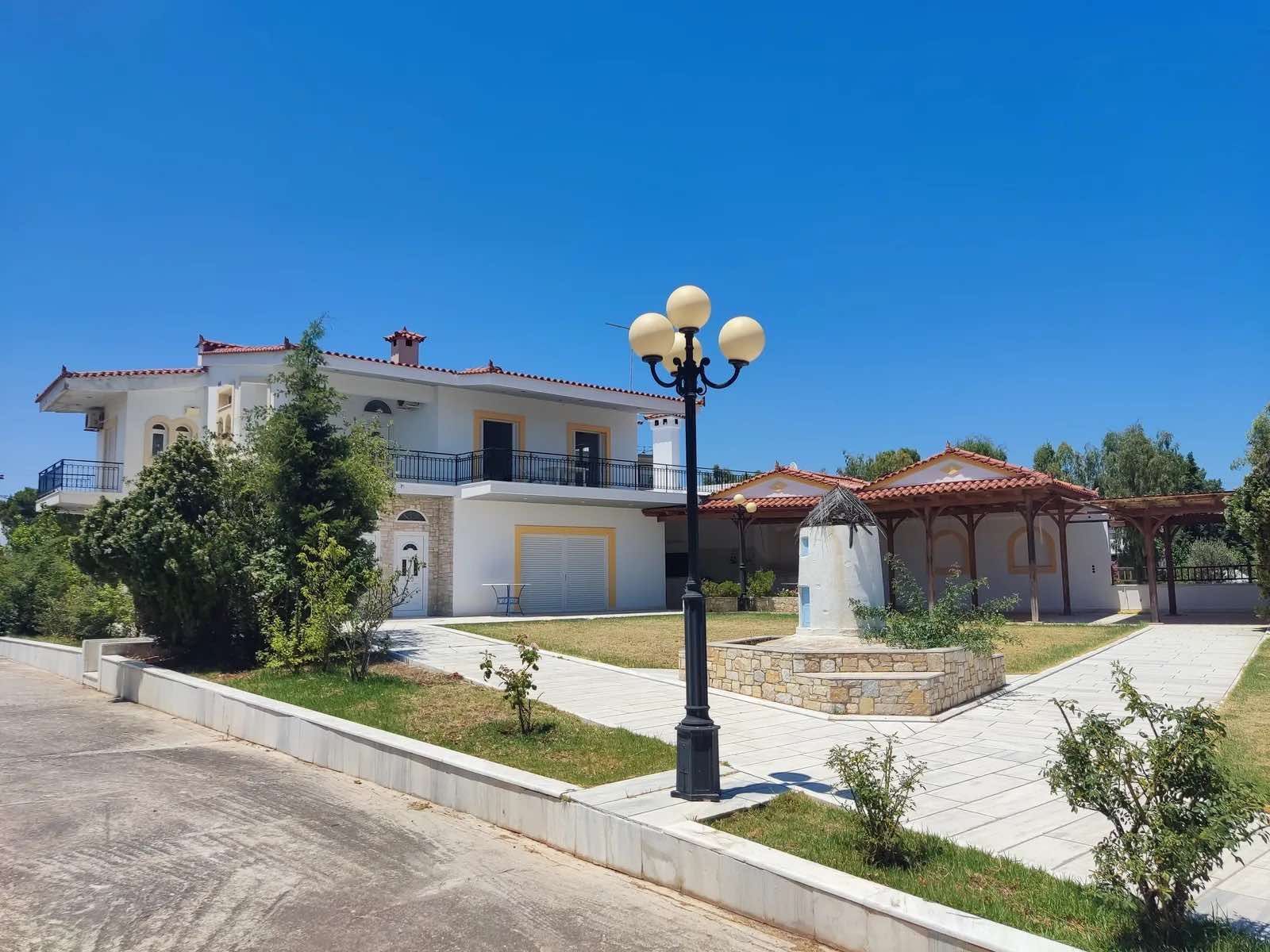Η κατοικία διαθέτει μεγάλες βεράντες με πανοραμική θέα στη θάλασσα, κλιματισμό, ηλιακό θερμοσίφωνα, κουφώματα αλουμινίου, μαρμάρινα πατώματα, ενώ περιβάλλεται από διαμορφωμένο κήπο με χλοοτάπητα, ανθοφόρα φυτά και οπωροφόρα δέντρα. Στον εξωτερικό χώρο υπάρχουν μπάρμπεκιου, στεγασμένοι χώροι χαλάρωσης, άνετες θέσεις στάθμευσης και αποθήκη, δημιουργώντας ένα ιδανικό περιβάλλον για ξεκούραση και φιλοξενία.