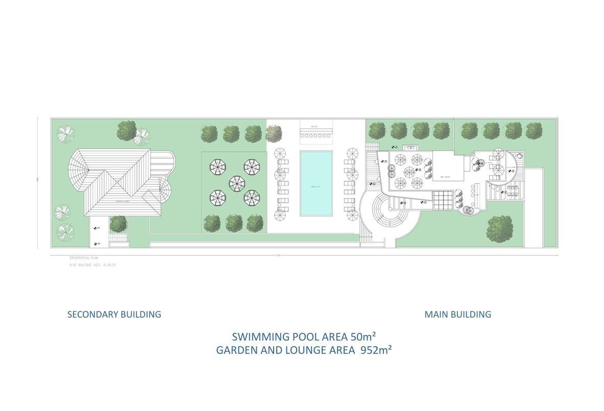 Ο περιβάλλων χώρος είναι διαμορφωμένος σε αρχαιοελληνικό ύφος με εσπεριδοειδή, μαρμάρινες κατασκευές και μοναδική αισθητική, ενώ διαθέτει πισίνα 5x12 μ. γλυκού νερού με δυνατότητα κατασκευής δεύτερης πισίνας θαλασσινού νερού, δημιουργώντας συνθήκες ιδιωτικού resort.